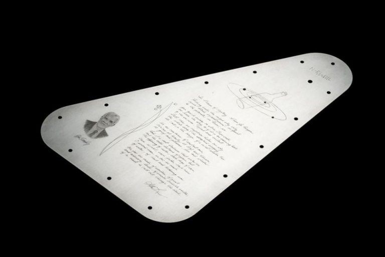 Пластина, выполненная в виде серебристого треугольника, содержит визуальное изображение звуковых волн, образуемых при произнесении слова «вода» на 103 земных языках. Визуально это послание выглядит как рябь на воде.