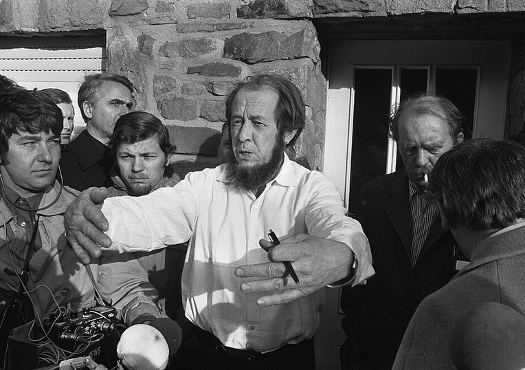 Однако, оказавшись в эмиграции, Солженицын примкнул к тем кругам западного истеблишмента, которые в СССР назывались «реакционными» и «милитаристскими». Писатель рассматривал ядерное оружие Запада как самый действенный инструмент политического давления на Советский Союз. В «Архипелаге ГУЛАГ» (1973 год) Солженицын передаёт содержание «тюремных обсуждений» политики Рузвельта и Черчилля. В послевоенные годы зэки ГУЛАГа пришли к выводу о «систематической близорукости и даже глупости обоих». Западные политики допустили экспансию СССР, хотя могли этого избежать.