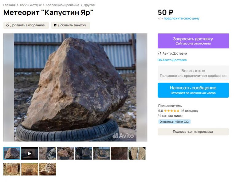 На сайте объявлений Avito выставлен на продажу метеорит весом 275 килограммов. Его цена составляет 14 миллионов рублей.