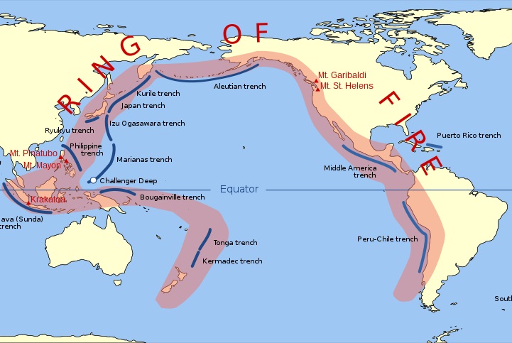 Океаническая кора состоит из нескольких литосферных плит, которые плавают на мантийном пласте. В районе Огненного Кольца Тихого океана, движение этих плит вызывает трение и сдвиг, что приводит к образованию горных хребтов, глубоководных желобов и вулканов. Ученые называют этот процесс погружением плит, или субдукцией.