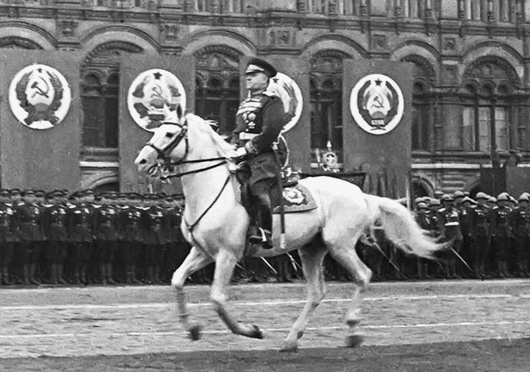 Впрочем, если верить Станиславу Аверкову, автору издания «Шпионы, создавшие советское ракетостроение», на то у Сталина были веские причины. Дело в том, что, согласно сценарию, в этот торжественный день Сталин должен был красоваться верхом на белом коне. Однако, как оказалось, вождь не слишком хорошо держится в седле и даже упал во время репетиции. Именно поэтому командование торжеством и доверили более опытному в кавалерийском деле маршалу Жукову. Парад 1945 года и Жукова на белом жеребце запечатлели на пленку кинооператоры.