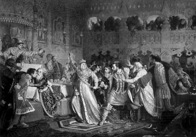 А дальше, как известно, князь Юрий взял Москву и умер на престоле. Ему наследовал оскорблённый на свадьбе Василий Юрьевич, которому потом выкололи глаз сторонники Василия II. Василия Юрьевича после этого стали именовать Косым. Войну продолжил его брат Дмитрий по прозвищу Шемяка. Когда уже он в свою очередь сумел взять в плен Василия Васильевича, то выколол ему оба глаза, и Василий II вошёл в историю под прозвищем Тёмный. Перед этим Василий, пока ещё не Тёмный, успел побывать в плену у казанских татар, откуда его выкупили, заплатив огромную дань. А закончилась усобица отравлением Шемяки агентами Василия Тёмного в 1453 году. Смута, вызванная выпадом вспыльчивой женщины, едва не привела только-только складывавшееся единое Русское государство на грань гибели.