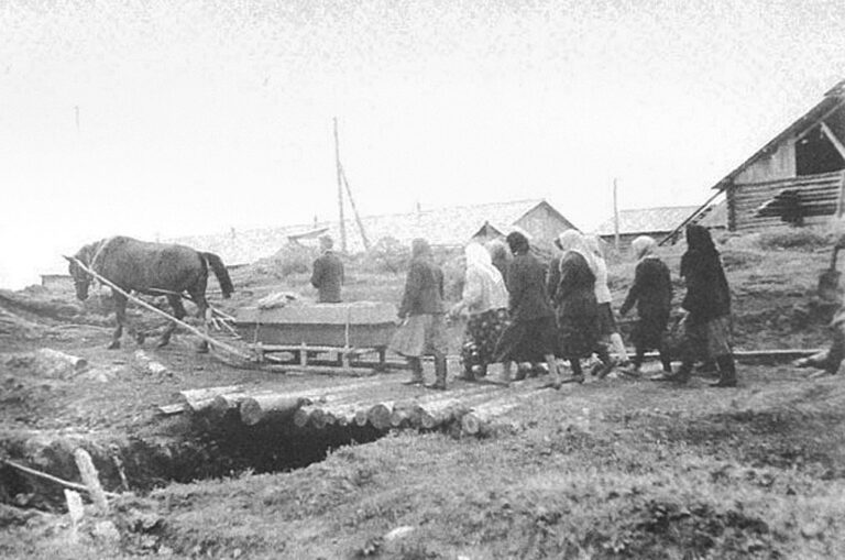 Когда такой живой покойник умирал, проводились двойные похороны. Первые – для отвода глаз. По деревне носили пустой гроб с заколоченной крышкой, который «степенно и горестно» закапывали на «поганом» кладбище. Вторые похороны были реальными. На них тело усопшего закапывали в тайной яме рядом со скитом.