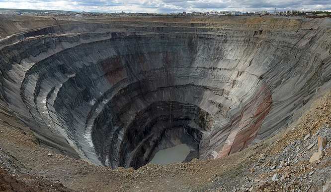 Карьер «Мир» — это гигантская воронка глубиной с полтора Эйфелевых башни (535 метров) и диаметром более километра. С 1957 по 2001 годы здесь добыли алмазов на 17 миллиардов долларов. Работа в карьере была невероятно сложной: путь грузовика с породой от дна до поверхности по спиралевидной дороге составлял 8 километров.