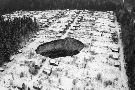 В Пермском крае возле Березников, Соликамска и Кунгура можно увидеть воронки и рукотворные озёра, берега которых вплотную подходят к жилым районам. Возникли эти образования в результате инженерно-геологических просчётов специалистов, занимавшихся разработкой Верхнекамского месторождения калийных и магниевых солей. На сегодняшний день насчитывается свыше 10 крупных воронкообразных провалов, заполненных водой, разрастание которых грозит вышеназванным городам полным уходом под землю.